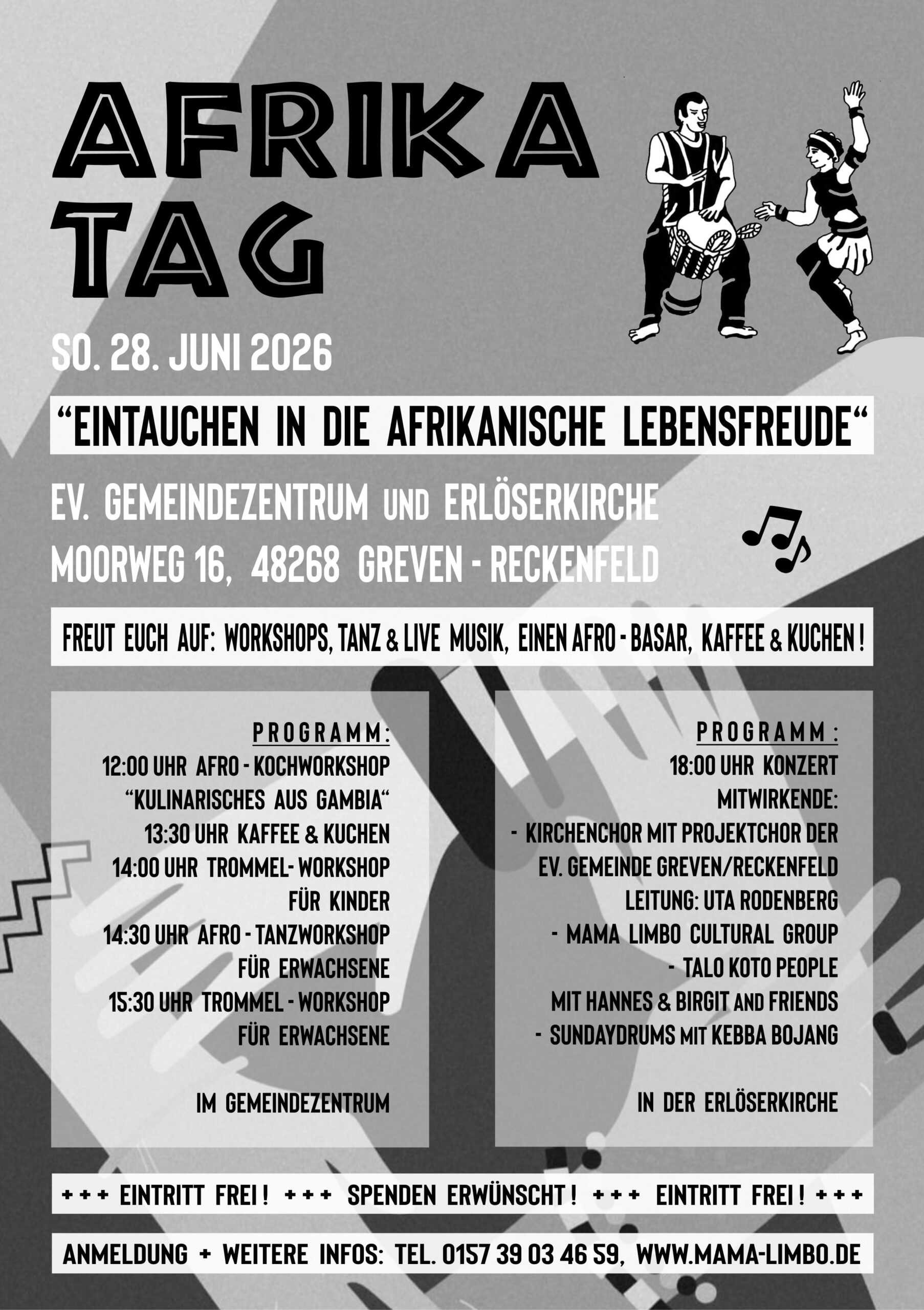 AFRIKA TAG am 28.06.2026 in Greven: Tauche ein in einen Tag voller Musik, Tanz, Trommeln und purem Lebensgefühl. Lass dich von der Energie Afrikas verzaubern! Wenn der Trommelmeister „Kebba Bojang“ von Mama Limbo aus Gambia ruft, entsteht eine einzigartige Verbindung aus Energie, Rhythmus und afrikanischer Lebensfreude. An diesem Tag wirst du Live die Kraft der Trommel spüren, deinen Körper durch Tanz befreien und mit anderen gemeinsam eine unvergessliche Zeit erleben. Alle Workshops sind für Interessierte mit oder ohne Erfahrungen. Erleben Sie, wie ansteckend und verbindend das Trommeln und/oder Tanzen in der Gruppe sein kann. Zudem gibt es am Abend ein Konzert mit verschiedenen Gruppen in der Erlöserkirche.